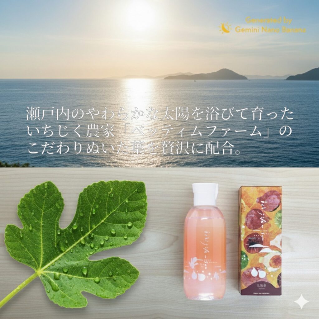 地元農家ベッティムファームで大切に育てられた、農薬不使用のいちじく。その葉には、瀬戸内の豊かな陽光が育んだ、肌に優しい保湿成分がたっぷりと含まれています。