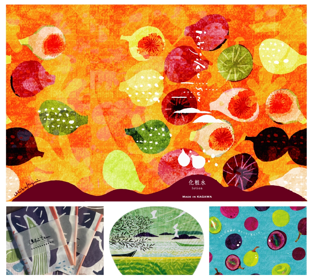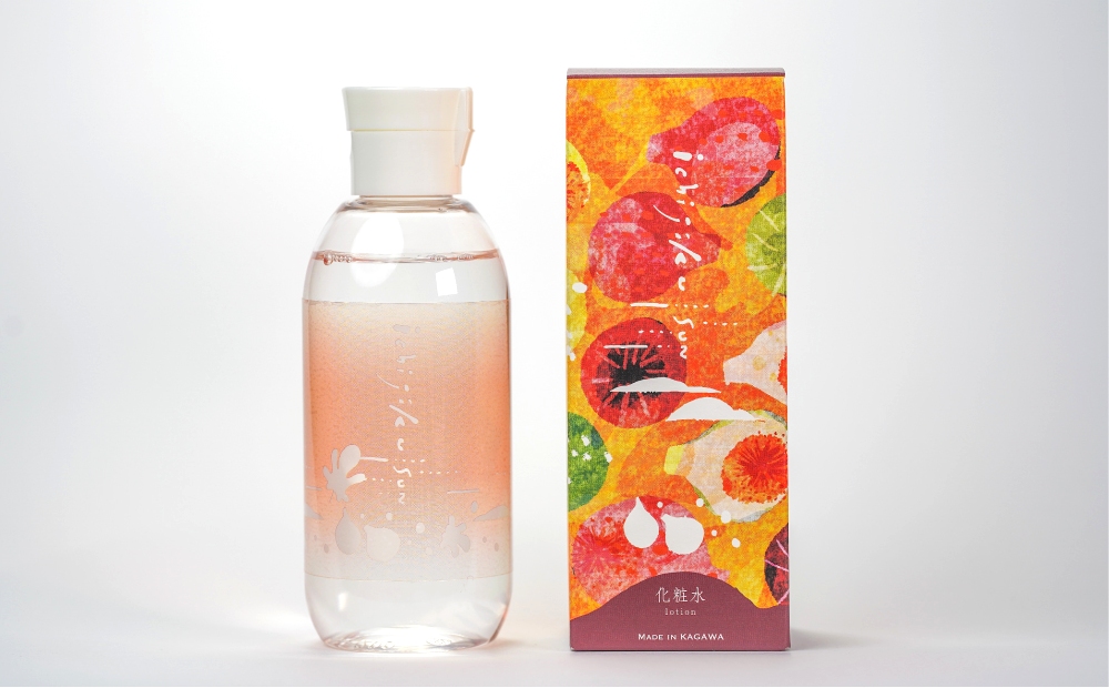 パッケージデザインは、香川県を代表するデザイナーのオビカカズミさん。 太陽にそそがれ生き生きとしたいちじくを感じさせる心おどるデザインとなりました。中のボトルには瀬戸内海の島々と夕日を想像することでしょう。そして、ローションがなくなるにつれ、新たな表情をみせるボトルデザインにも注目です。